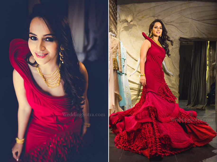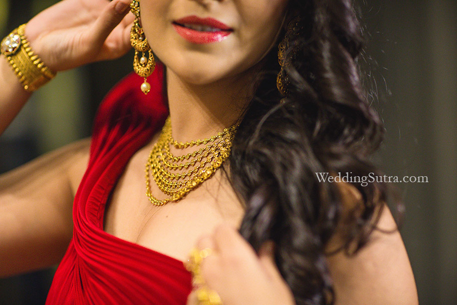 We started with the lehenga trials at the Gaurav Gupta Studio, a dream come true for me. I picked a gorgeous off-the-shoulder lehenga in red with ruffled detailing that made me look like a princess. The timeless gold jewellery from Azva made the entire look stand out. I chose an intricate statement choker and paired it with large earrings for contrast. Lekha Shah did my make up using the finest from Lakme Absolute to give me a very elegant and chic look that perfectly complemented my ensemble. She also styled my hair in beautiful cascading waves making me feel like a pretty mermaid!