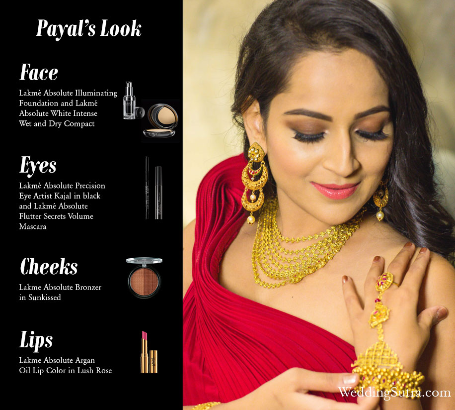 To create an elegant, sophisticated look on Payal, makeup artist Lekha Shah first evened out her face with the Lakmé Absolute Illuminating Foundation. She then brushed a small amount of Lakmé Absolute White Intense Wet and Dry Compact to set the foundation creating a flawless base. For an understated glam, Lekha chose to skip the blush entirely and focus instead on warming up Payal’s face with the Lakme Absolute Bronzer in Sunkissed. She then turned her attention to Payal’s eyes to create a dramatic smoky eye by lining her waterline with the Lakmé Absolute Precision Eye Artist Kajal in black. Add some generous coats of the Lakmé Absolute Flutter Secrets Volume Mascara and it was done! The glamorous bridal look was completed with a touch of the gorgeous Lakmé Absolute Argan Oil Lip Color in Lush Rose.