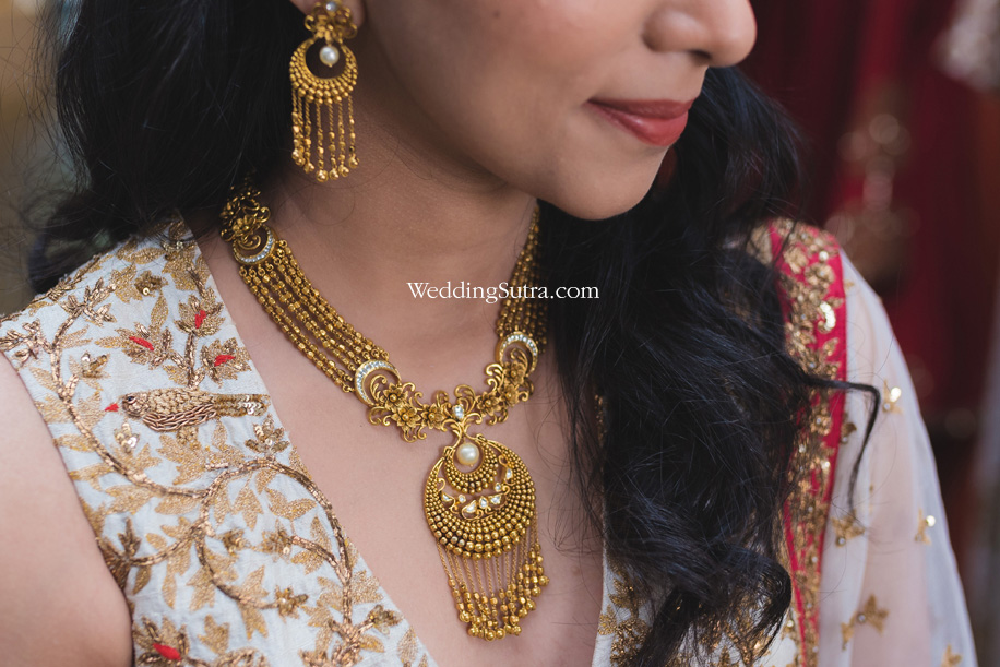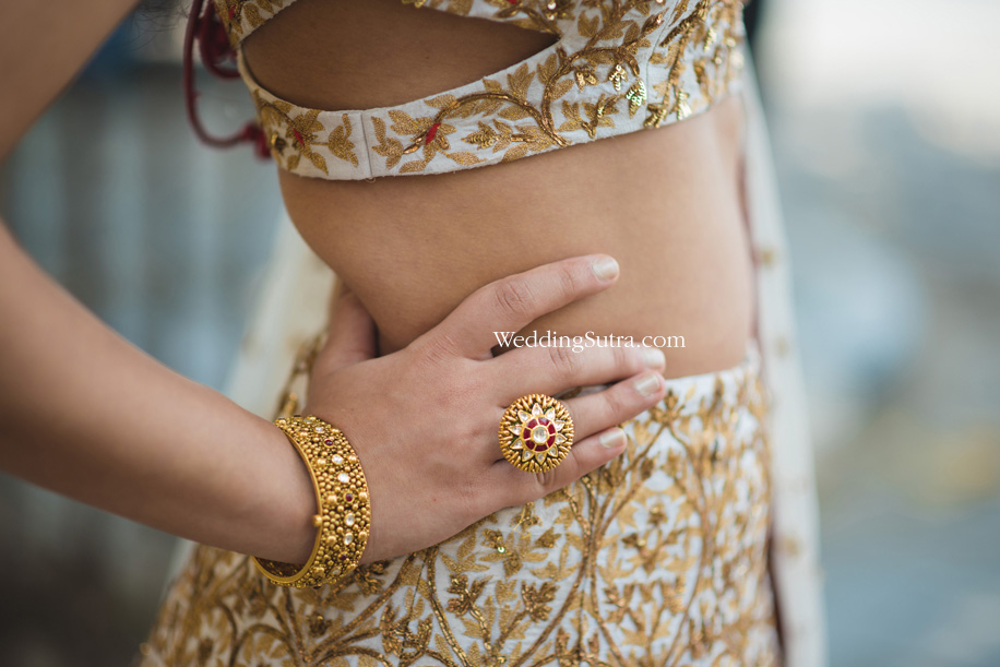 Pooja’s choice of a beautiful white lehenga embellished with bronze and gold embroidery exuded elegant charm. She paired her ensemble with a dupatta that had an intricate red border with embroidery all over. The gold medallion set from AZVA along with earrings, a gold bangle and a bespoke ring were perfect accessories. Impressed by the craftsmanship of the pieces she said, “For a bride, it is the jewellery that is the most essential part of the ensemble. The beautiful sets from AZVA enhance every bridal outfit whether it’s for a traditional ceremony or a reception party. These gold masterpieces add bling with a touch of tradition to every look.”