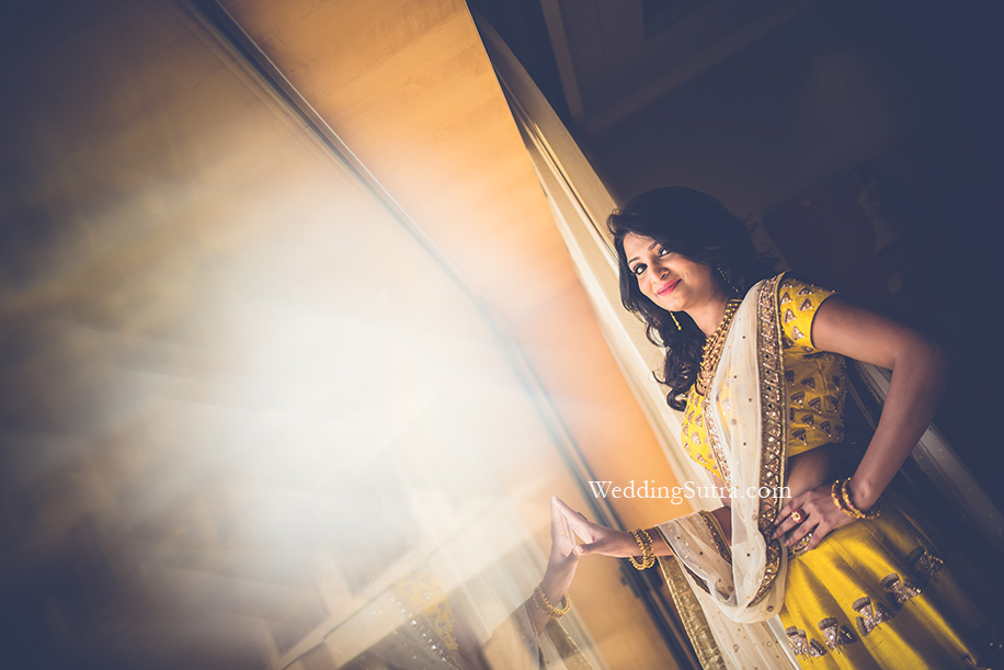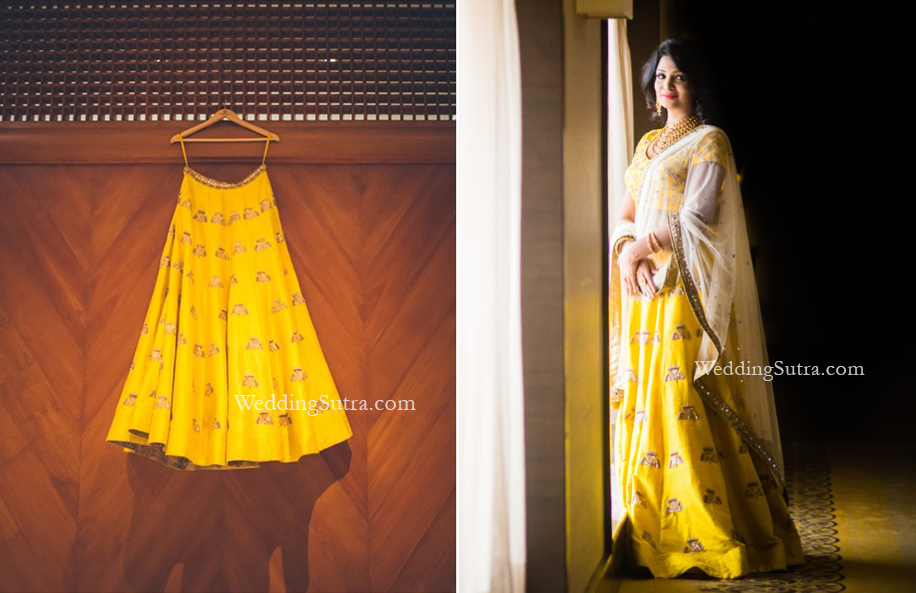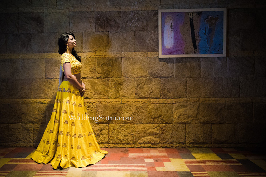 As with so many bridal makeovers here at WeddingSutra on Location, Purva took the opportunity to try something new and out of the box. She says, “I have nothing yellow in my own wardrobe and honestly I wasn’t keen on picking a color like that because I was convinced it wouldn’t suit me. But this lehenga was beautifully made and there was something so sophisticated about it. It was light, comfortable and I wore it for hours without feeling weighed down. I simply loved it!”