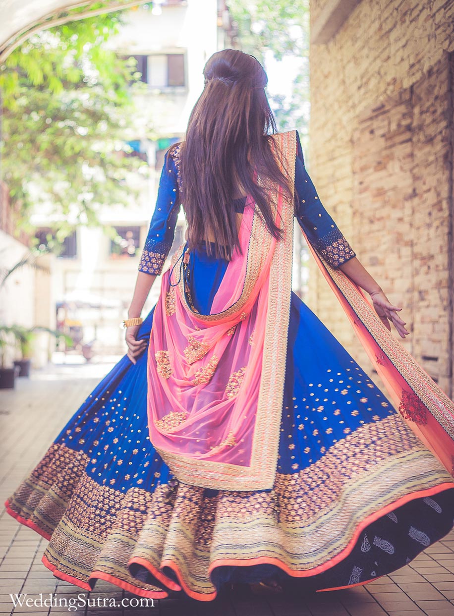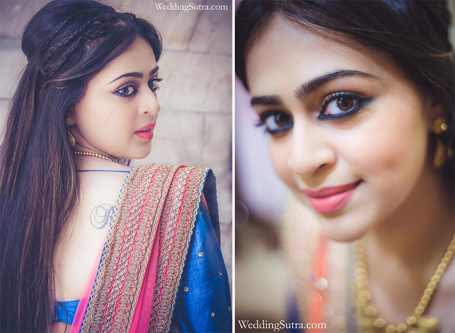 On the day of the event, I reached AZA earlier than the scheduled time (I wasn’t sure what the traffic would be like and I didn’t want to be late even by a minute!). Anshu and Tejal from WeddingSutra introduced me to the experts they had invited- Stylist Nisha Kundnani, Makeup Artist Recinda Martis and Candid Photographers Ashwin & Jhalak of Shades Photography. I also met three other brides-to-be who were a part of the shoot, it was nice chatting with them and we all talked about our plans. Now that I had got to know everyone on Location, it was time to start working on what-to-wear. Nisha Kundnani took me around, there were many vibrant options to choose from, but a cobalt blue lehenga by Delhi-based designers Madsam Tinzin caught my eye. It was embellished with beaded floral motifs, and paired with a blush-peach net dupatta. After I tried it on, I loved it even more, it was a great match of two contrasting colors, simple, yet classy. Nisha then helped me drape my dupatta and paired my lehenga with jewellery from Azva. The set she chose was elegant and contemporary and I think it truly enhanced the look.