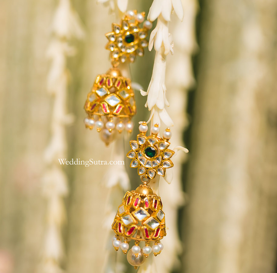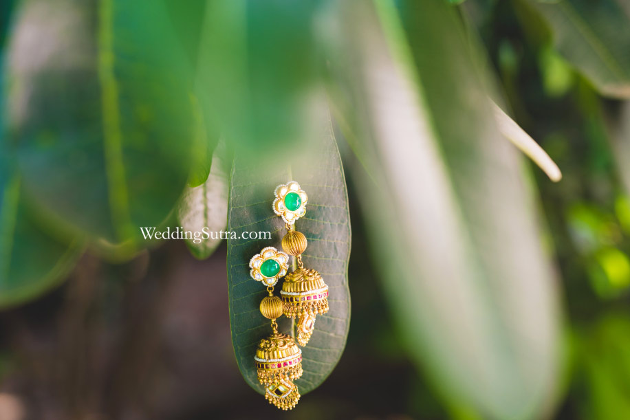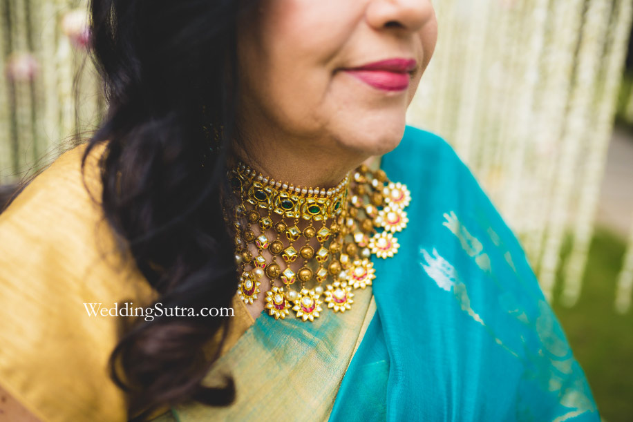 ‘Timeless and graceful’ was the aesthetic accorded to Richa’s mum. Each one of the baubles chosen for her was a classic with everlasting charm. A gold choker by Tanishq was the highlight of her ensemble. The necklace layered a row of emeralds upon a lattice of gold and kundan elements trimmed with pretty floral motifs. This was teamed with a pair of gold jhumkis featuring a row of pearls and a bold kada that made a statement.