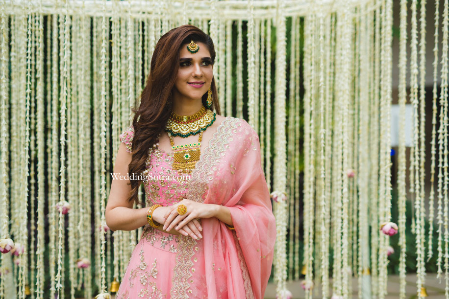 The candy pink lehenga by Anushree Reddy at AZA Fashion Bandra was selected keeping in mind the bride’s complexion and the cheery hues added to her bridal glow. The beauty of the monotone outfit was heightened by the silver floral detailing. The bride loved it, and said, “This lehenga was just gorgeous and was appreciated by everyone. The color made it perfect for a morning occasion and had I seen this before finalizing my trousseau, I would have picked this as the outfit for my big day.”