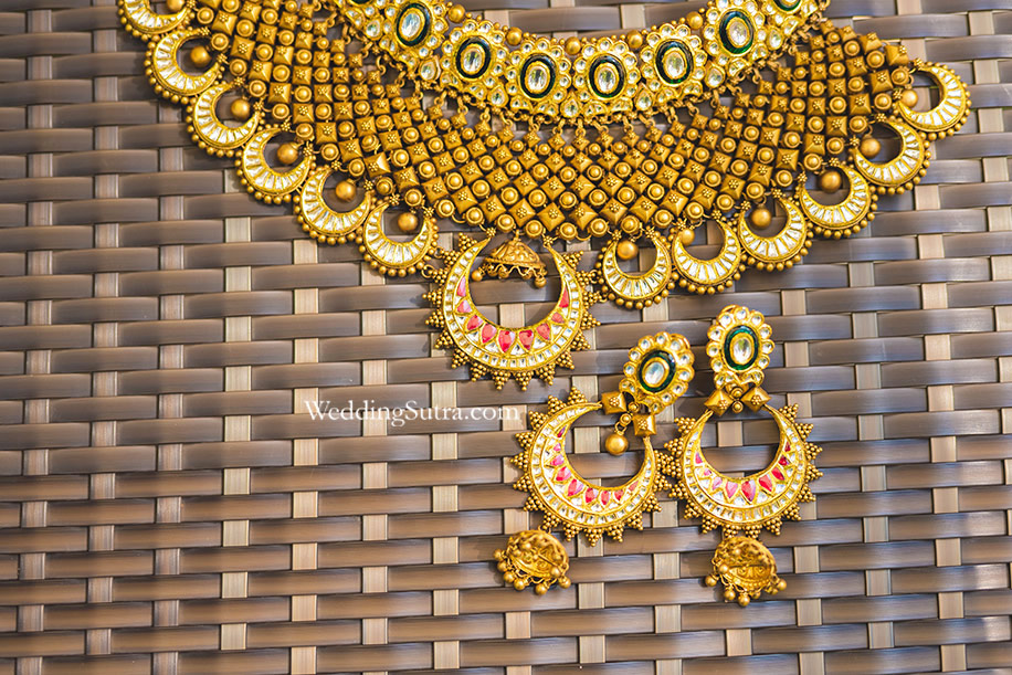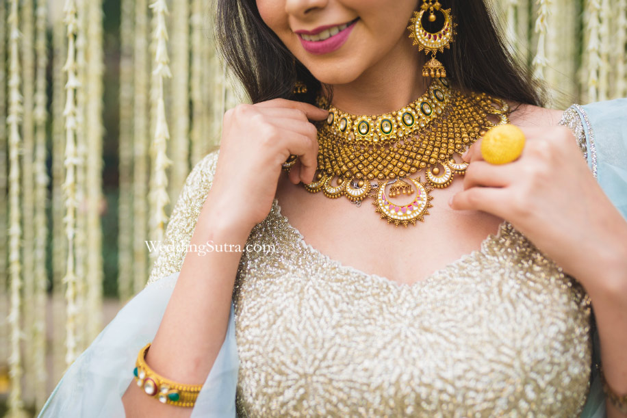 “Richa’s wedding is something that both of us have talked about for years and a part of me still can’t believe that all of this is really happening. Naturally, there are a lot of sentiments and emotions that we all are experiencing but it’s mostly happiness. As for my wishes, all I want is for her to have the happiest life ahead!” Traditional Indian aesthetics have their own charm and for Richa’s best friend, it was a classic aesthetic all the way. A tiered necklace by Tanishq made for an ideal choice. The rows of gold and kundan motifs placed in ascension trapped golden beads in their sockets, a charming detail. The necklace was fringed by large drop-shaped patterns that brought in some drama to the piece. The look was completed with golden jhumkis featuring intricate relief work and a kundan maang tikka trimmed with pearls. A maharani style kundan ring was also included in the ensemble.