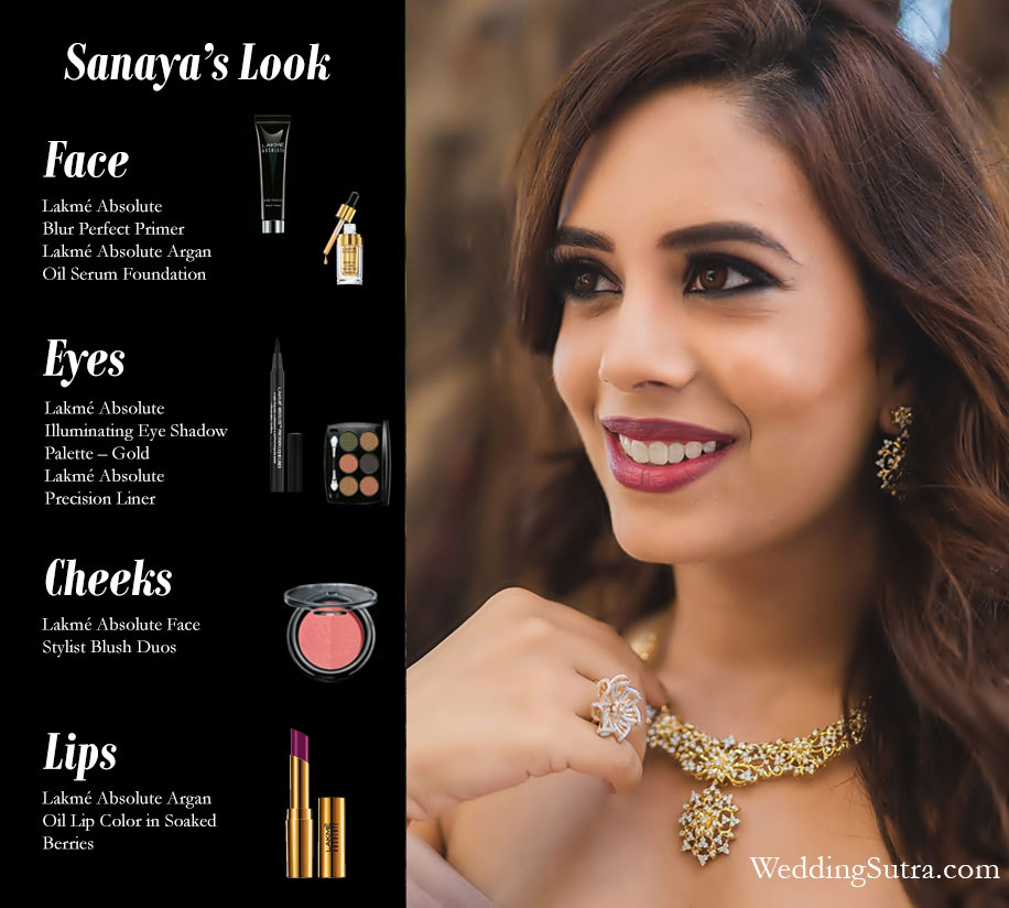 Makeup artist Sejal Sachnakul began by creating a canvas of even-toned skin on Sanaya by using the Lakmé Absolute Blur Perfect Primer. She followed this with the Lakmé Absolute Argan Oil Serum Foundation in Rose Silk to achieve a glow that made Sanaya’s skin look like it shone from within. To give her perfect smoky eyes, she used the Lakmé Absolute Illuminating Eye Shadow Palette – Gold and added drama with the Lakmé Absolute Precision Liner. The Lakmé Absolute Face Stylist Blush Duos added a soft flush on Sanaya’s cheeks while the Lakmé Absolute Argan Oil Lip Color in Soaked Berries stained her lips in a deep hue.