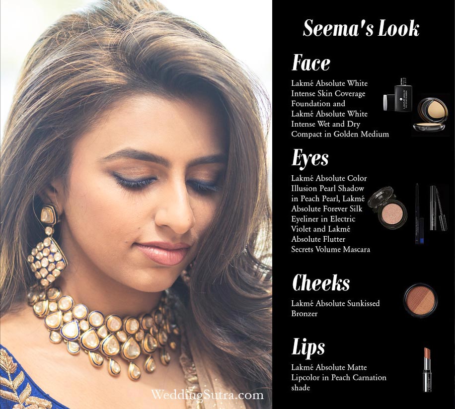 Makeup artist Recinda Martis decided to add drama to Seema’s eyes with muted makeup on the rest of the face. She created the base with the Lakmé Absolute White Intense Skin Coverage Foundation in Beige Honey and set it with the hydrating formula of Lakmé Absolute White Intense Wet and Dry Compact in Golden Medium. To highlight the eyes, Recinda used the Lakmé Absolute Color Illusion Pearl Shadow in Peach Pearl as the base and used the Lakmé Absolute Forever Silk Eyeliner in Electric Violet along the lash line and waterline to add drama. She finished with a few coats of the Lakmé Absolute Flutter Secrets Volume Mascara. Recinda then brushed a slight hint of the Lakmé Absolute Sunkissed Bronzer on her cheeks and applied two coats of Lakmé Absolute Matte Lipcolor in Peach Carnation shade. Finally, her hair was styled in soft waves for a sangeet ready look.