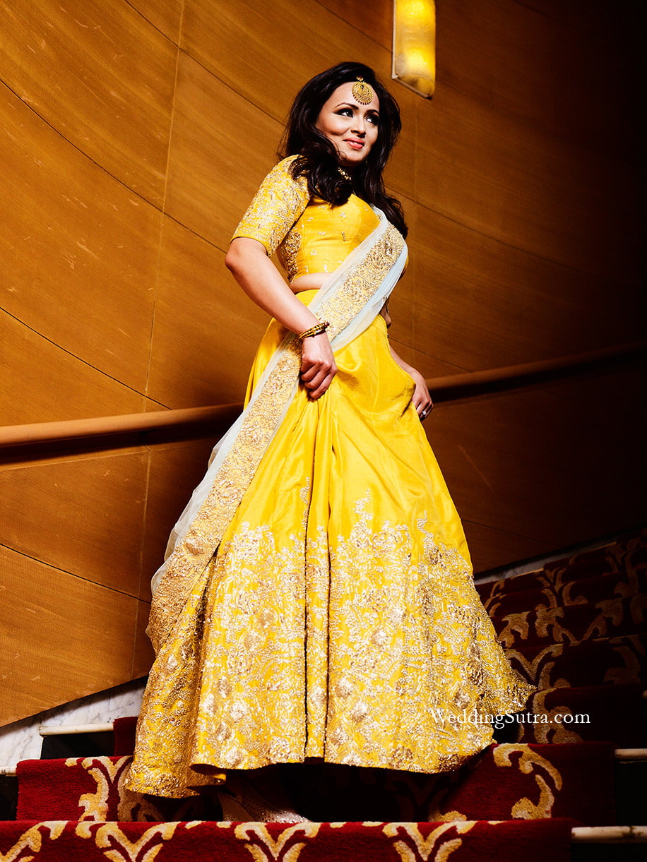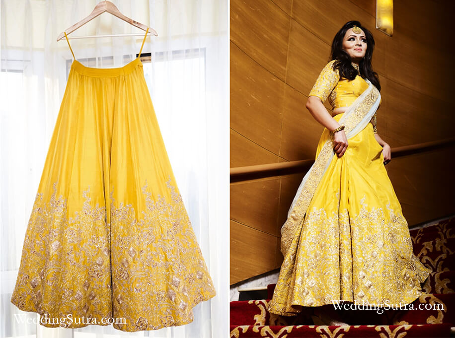 Cheery Yellow Aneesh Agarwaal Lehenga from Flyrobe which is originally priced at Rs 69,000 and can be rented at Rs 8,999