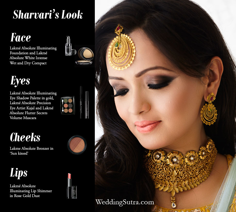 Sharvari’s make up was semi-matte and natural to balance out her bright yellow lehenga. Ojas started with the Lakmé Absolute Illuminating Foundation on Sharvari’s flawless skin. The base was set with a gentle brush of the Lakmé Absolute White Intense Wet and Dry Compact around her T-zone which she complained of being oily. Ojas then applied the most gorgeous shade of bronze from the Lakmé Absolute Illuminating Eye Shadow Palette in gold to give her a beautiful smoky eye. To accentuate her doe-shaped eyes, he lined them with the Lakmé Absolute Precision Eye Artist Kajal in black and applied the Lakmé Absolute Flutter Secrets Volume Mascara for extra dimension to her eyes. The next step involved warming up her cheekbones with the Lakme Absolute Bronzer in Sunkissed to give her a soft-contoured look. Ojas finished with the Lakmé Absolute Illuminating Lip Shimmer in Rose Gold Dust to complete the bridal look to perfection.