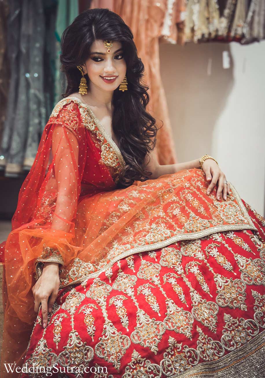 The location was Ensemble, Bandra, a store known for its beautiful outfits from coveted designers from all over India. Team WeddingSutra introduced me to the experts and the other brides-to-be, and then we started with the search for the Lehenga. Keeping in mind my petite figure, Anshu from WeddingSutra helped me pick a beautiful ombre-dyed lehenga, which was from a deep peach to an orangey red with antique embroidery, created by Ensemble’s in-house team. It was paired with a red raw silk blouse with a sweetheart neckline, and a beautiful net red dupatta.