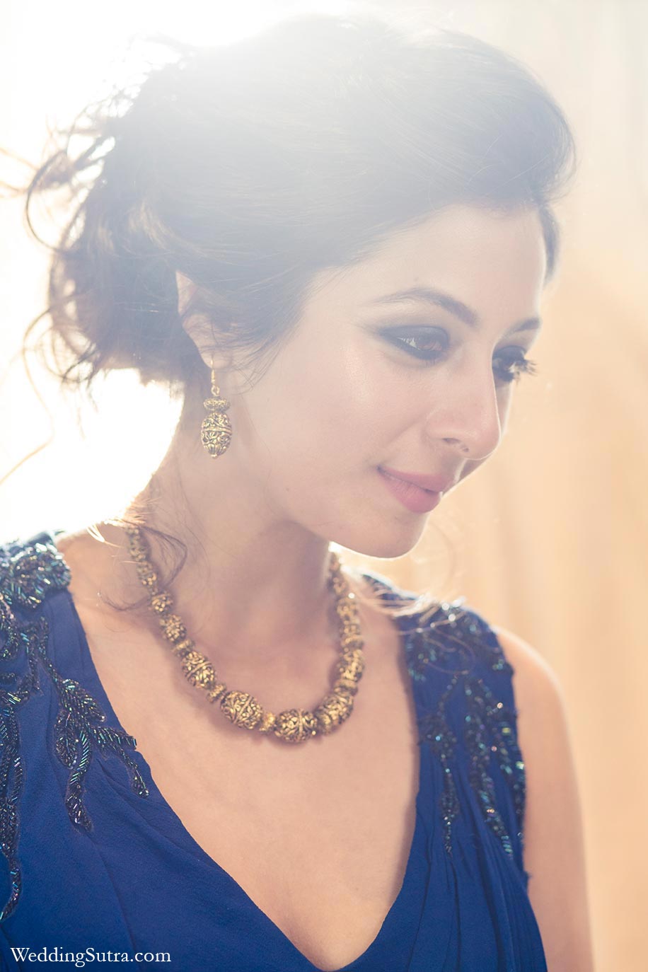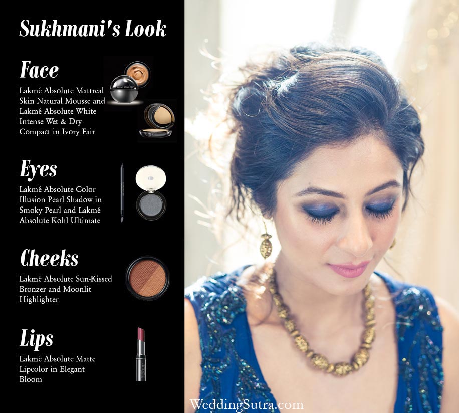Sukhmani is blessed with flawless skin, inspiring makeup artist Recinda Martis to keep her face natural and dewy. She brought drama to her evening look with sexy, smokey eyes, a hint of blue to complement her glamourous blue outfit. Recinda built a base with the creamy Lakmé Absolute Mattreal Skin Natural Mousse in Ivory Fair and set it with the Lakmé Absolute White Intense Wet and Dry Compact in Ivory Fair. She glammed up Sukhmani’s eyes by creating a base with the Lakmé Absolute Color Illusion Pearl Shadow in Smoky Pearl and finished with a smudge towards the corner of her lids using Lakmé Absolute Kohl Ultimate. The Lakmé Absolute Sun-Kissed Bronzer was employed to contour Sukhmani’s cheekbones, which were then brushed with Lakmé Absolute Moonlit Highlighter for a luminous finish. Recinda kept the lips soft by using the Lakmé Absolute Matte Lipcolor in Elegant Bloom shade. Finally, Sukhmani’s hair was styled in a chic messy bun.
