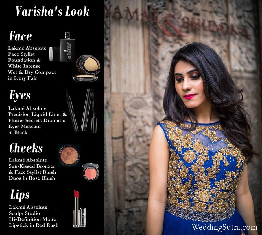 “Varisha is a vivacious and bold bride-to-be willing to try out different looks”, shares Makeup artist Amrita Sangavi. Amrita decided to give her bold lips complimenting Varisha’s skin color. Since lips were the highlight, Amrita kept the rest of the makeup minimal and muted. She started with creating the base with the Lakmé Absolute Face Stylist Foundation in Ivory Fair and set it with the Lakmé Absolute White Intense Wet and Dry Compact in Ivory Fair. She accentuated her gorgeous almond shaped eyes with Lakmé Absolute Precision Liquid Liner and few coats of the Lakmé Absolute Flutter Secrets Dramatic Eyes Mascara on her lashes. She then used the Lakmé Absolute Sun-Kissed Bronzer on her cheekbones to contour her face and finished with a soft hint of the Rose Blush shade of the Lakmé Absolute Face Stylist Blush Duos. For the bold lips Amrita used the newest Lakmé Absolute Sculpt Studio Hi-Definition Matte Lipstick in Red Rush shade. Finally, Varisha’s hair was styled in soft waves. Amrita shares a tip with bride-to-be, “When the whole ensemble is predominantly blue, avoid using blue in any form in your makeup”.