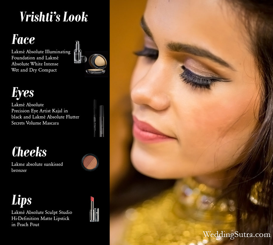Lekha started with applying the feather-light Lakmé Absolute Illuminating Foundation that evenly blends into the skin, and set it with the hydrating formula of Lakmé Absolute White Intense Wet and Dry Compact in Ivory Fair. To highlight the eyes, Lekha used the Lakmé Absolute Precision Eye Artist in black to create a double-winged eyeliner. She paid special attention to Vrishti’s lashes by applying a couple of coats of the Lakmé Absolute Flutter Secrets Volume Mascara. For the lips, Lekha used the Lakmé Absolute Sculpt Studio Hi-Definition Matte Lipstick in Peach Pout. Finally, her hair was styled in simple curls.
