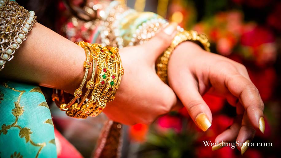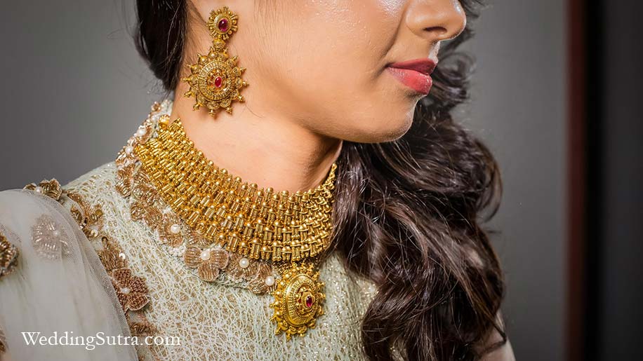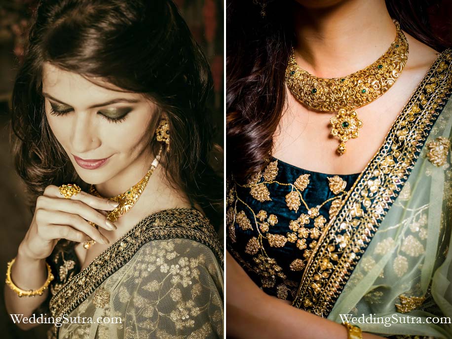 Team WeddingSutra then gave me a beautifully crafted gold choker from Azva that complemented my outfit perfectly. The bangles and earrings completed the look.
