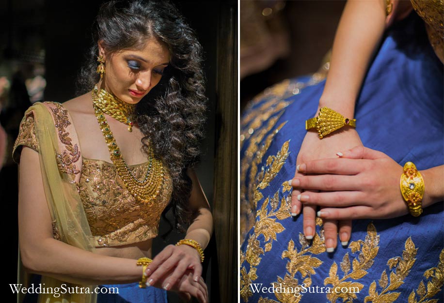 Then we looked at accessories. The gold jewellery from Azva was gorgeous and by now I just relaxed as Team WeddingSutra styled one of the chokers and raani haars together to create a grand bridal look. We further complemented it with delicate earrings and bangle.