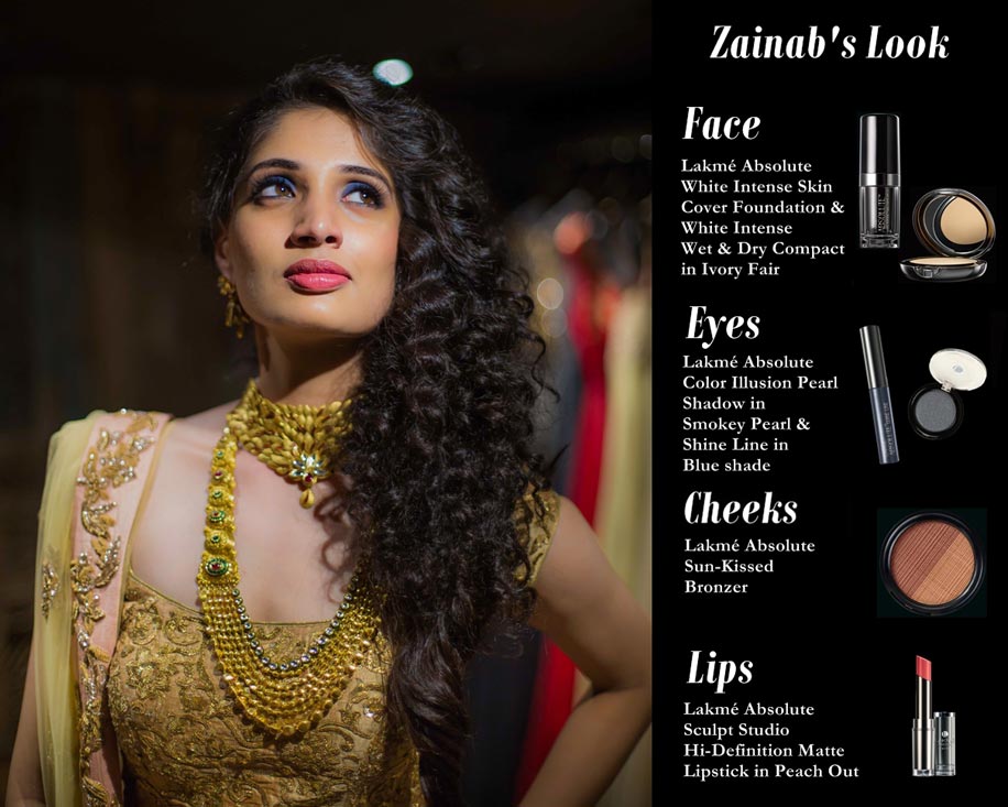 “Zainab has beautiful hazel colored eyes which I wanted to accentuate”, shares Makeup artist Amrita Sangavi. She started with creating the base with the Lakmé Absolute White Intense Skin cover Foundation in Ivory Fair for a polished finish and set it with the Lakmé Absolute White Intense Wet and Dry Compact in Ivory Fair. Since the eyes were the highlight, Amrita decided to keep the rest of the makeup muted.To highlight Zainab’s eyes, she used the Lakmé Absolute Color Illusion Pearl Shadow in Smokey Pearl for a shimmery and bold blue base and used the Lakmé Absolute Kohl Ultimate to give a bold smokey effect. She then lined her eyes with the Lakmé Absolute Shine Line in Blue shade and finished with a few coats of the Lakmé Absolute Flutter Secrets Dramatic Eyes Mascara. She then sculpted Zainab’s jawline and cheekbones with the Lakmé Absolute Sun-Kissed Bronzer to highlight her sharp features. To enhance Zainab’s fuller lips, Amrita used the nude Peach Out shade in the Lakmé Absolute Sculpt Studio Hi-Definition Matte Lipstick. Finally she styled her curly hair onto one side.