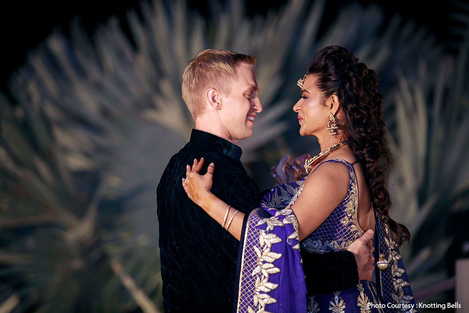 While on the second day of the wedding festivities, Aashka and Brent had a very vibrant and colorful sangeet. The bride wore a gorgeous royal blue lehenga by Archana kochhar and intricate jewellery from ORRA.