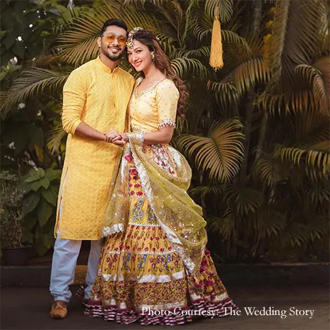 The festivities began with a vibrant Chiksa function, which saw a gorgeous blue and yellow décor setup, followed by the bride’s mehndi and the mehndi ceremony. Gauahar sported a host of different attires in hues of yellow for the lively festivities, teamed with exquisite floral jewellery custom made for her by Puneet Gupta Invitations. Puneet Gupta shares, “The jewellery was designed keeping in mind not just Gauahar’s outfits but also her chirpy personality and the couple’s love for each other.” Each carefully designed piece of her Mehndi jewellery was woven with embellishments of the couple’s initials, ‘GZ’ and ‘GaZa’. For the Chiksa function, Gauahar amped up her look with fresh floral jewellery that included carnations and delicate sprigs of baby’s breath. Puneet Gupta Invitations also designed hand-made gota mehndi cones for the guests that were accompanied with adorable messages from the bride and groom. The couple sported a traditional yet boho ensemble in gorgeous teal hues for the glamorous Sangeet.