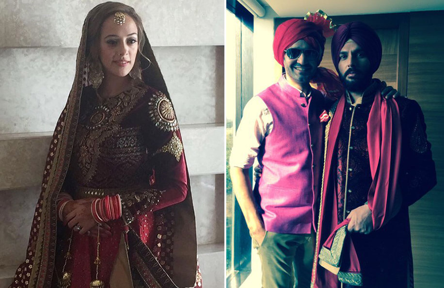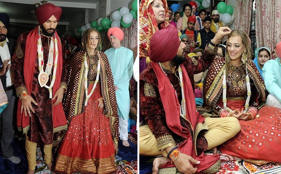 The couple were married in a traditional Sikh ceremony at a dera in the Fatehgarh Sahib Gurudwara in Chandigarh. In a nod to tradition their wedding attire reflected Sikh culture and was designed by JJ Valaya. Hazel and Yuvraj color coordinated – she wore a deep red lehenga with antique embroidery while Yuvraj wore an elegant sherwani with pagdi and jootis.