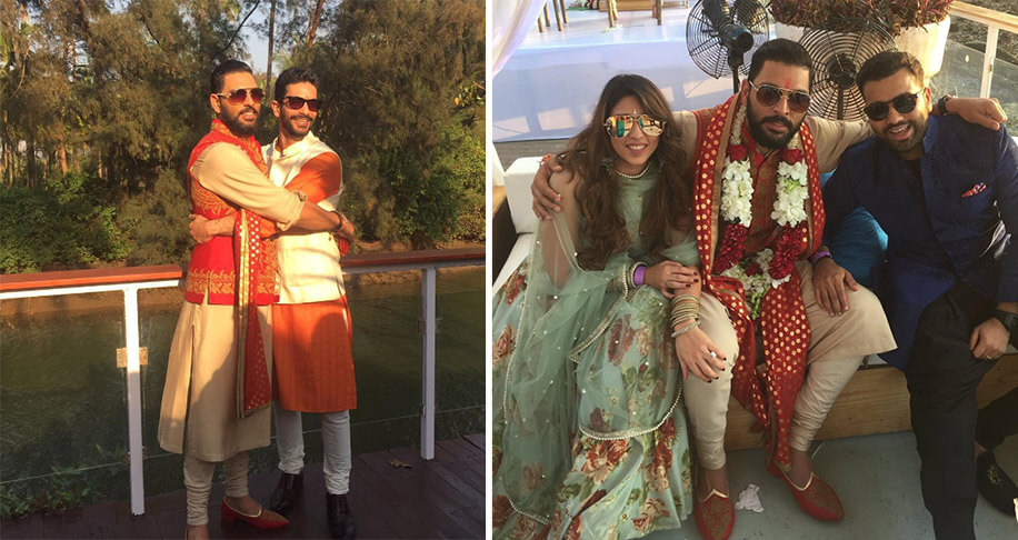 Hazel is a Hindu of Mauritian ethnicity and the couple wanted a Hindu ceremony by the beach. They organized a second wedding at the Teso Waterfront in Siolim, Goa. The wedding was attended by many cricket and film personalities including Rohit Sharma, Rannvijay Singha, Aashish Chaudhary and Angad Bedi. Yuvraj made a grand entry into the venue on a 4×4 ATV, adorned in a kurta-pyjama and crop jacket and reflector sunglasses. Hazel wore a beautiful red embellished Benarasi saree with a zardozi kamarbandh designed by Ashley Rebello. She chose intricate Anmol Jewelers to complete her royal look. The décor was entirely in white and gold to suit the dreamy nature of the beach wedding. For their post-wedding festivities, the couple changed into pastel ensembles with Hazel wearing a beautiful, floor length fairytale gown in pale pink while Yuvraj complemented her in a muted blue suit.