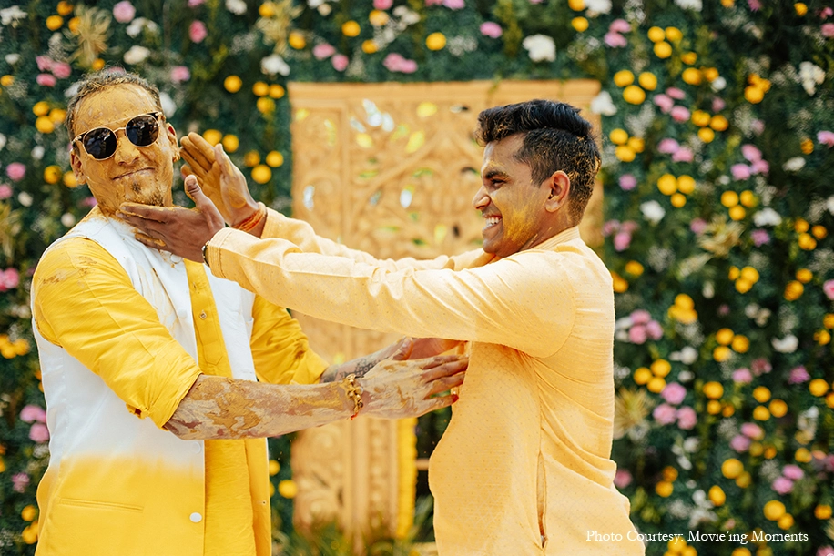 A boisterous Haldi celebration heralded the wedding where the couple got a true desi style glow-up amidst tons of laughter and joy. Hosted under the sunlit sky and decorated with marigolds, the Haldi was in tandem with tradition. The couple had a gala time as they ambled under the bright Goan sunshine.