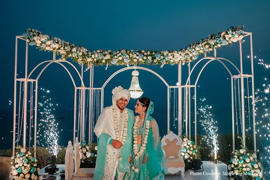 For their sundowner Wedding by the shore, the couple took a step away from the usual ceremonial hues and instead chose a beautiful turquoise shade that further accentuated the natural beauty around them. With a minimalistic floral mandap being the highlight of the wedding, the couple looked straight out of a fairytale during the phera ceremony. Ishani was the showstopper in her turquoise lehenga with gota patti work, while Rahul on the other hand, donned an ivory embroidered sherwani with an elegant stole that matched Ishani’s lehenga.
