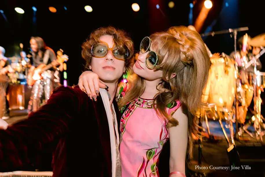 The wedding kicked off with a British Invasion Mod Party at The Palace of Fine Arts in San Francisco on Thursday night, the decor of which was inspired by Barberella, the 1968 sci-fi film transforming what normally feels like an airline hanger inside into a full-fledged nightclub, complete with shiny silver walls. The couple and their guests dressed for the theme party, in short, sexy sequins, gogo boots, and big half up, half down hair while professional dancers put on a show in clear plastic bubbles and Mark Ronson DJed leading to the performance by Earth Wind & Fire took the stage. Ivy sported not one but three looks for the evening.