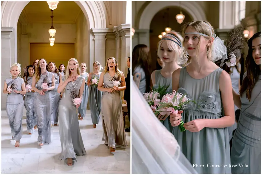 The wedding day started with a pajama party for the bride and her squad of 14 bridesmaids. The legendary designer John Galliano designed the bride’s iconic bridal gown as well as each of the bridesmaids’ dresses that were custom made for everyone in delicate shades of grays and lilacs. Ivy paired her couture mirror-work dress with a 16-foot veil hand-embroidered with sentimental motifs, an avant-garde headdress, pieces from her grandmother’s jewelry collection, and custom Christian Louboutin pumps designed in collaboration with John Galliano. The entire rotunda of City Hall was transformed with bright teal and pink Persian rugs, velvet drapes with 12” long gold thread fringe, thousands of pale pink dendrobium orchids, large urns of pastel roses, and more, a nod to Ann Getty’s aesthetics. The adorable flower girls were dressed as butterflies, and the Speaker of the House Nancy Pelosi officiated the ceremony. Music composed by the bride’s late father Gordon Getty was performed, while best man Frederic Trohler and Ivy’s rescue Chihuahua mix, Blue played ring bearers. Queue Myra, the singer known for her hit in The Princess Diaries played “Miracles Happen” from the balcony.
