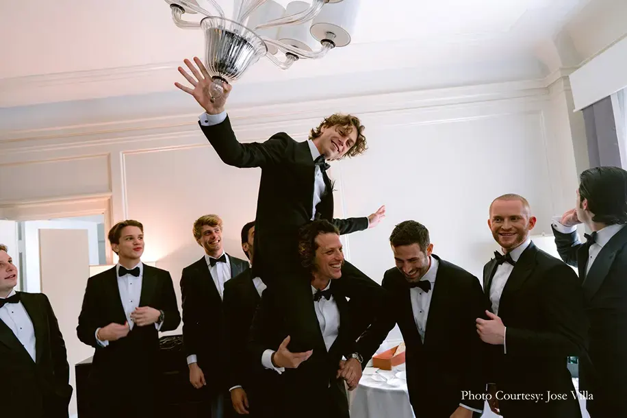 The next day began with a picnic lunch at the Log Cabin on Presidio, overlooking the city. Sentimental to Ivy, butterflies were incorporated into the decor. Ivy embodied romance with an edge in a stunning black lace archive Alexander McQueen gown hand-embroidered with dozens of butterflies. A ceremony rehearsal at City Hall in the evening was followed by an intimate dinner at Quince restaurant, for which Ivy wore a sequin midi dress in shades of fuchsia, black, and white, paired with a custom headpiece, designed by Paul Burgo.