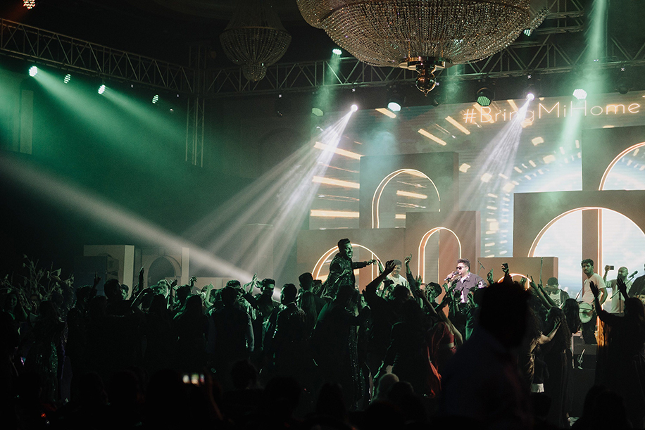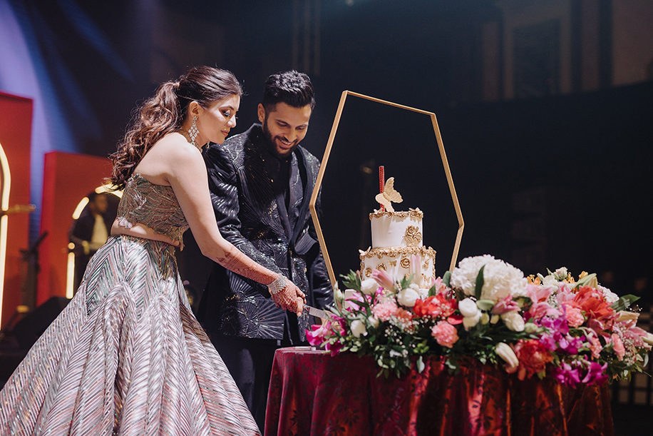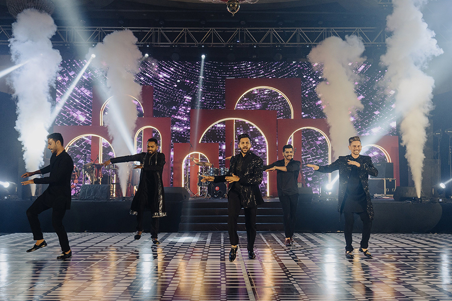 Designed with a contemporary edge, the highlight of the sangeet was the colossal stage where the bride and groom and their loved ones shook a leg. Multiple arches, an LED backdrop and a monochromatic dancefloor ensured everyone had a gala time while enjoying their favourite beats.