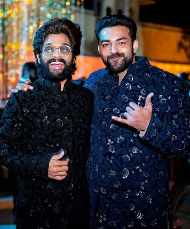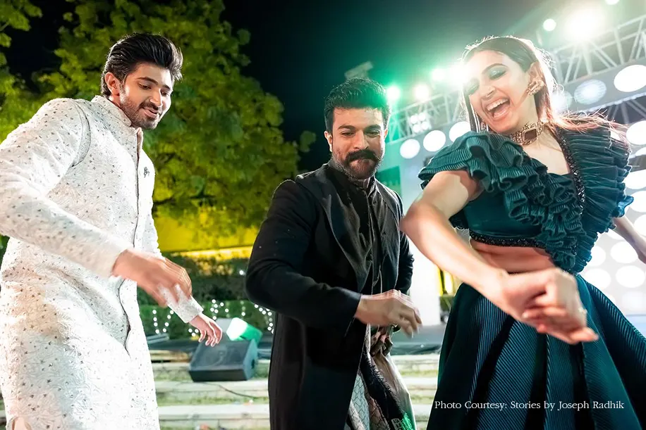 Adorably captioned posts by the bride and her father as well as her cousin and actor Allu Arjun of their arrival in Udaipur by Chartered flights were trending on Monday, getting everyone revved up for the upcoming revelries. The evening began with a glamorous Sangeet brimming with gorgeous decor, dreamy lights, and dazzling performances that lit up the night. Niharika flaunted a deep teal couture piece by Shantanu and Nikhil with a chic sleek hairdo and stunning diamonds, while Chaitanya looked diving in an ivory embroidered sherwani by Kunal Rawal. The couple set the dance floor on fire grooving to Chiranjeevi’s iconic songs. Pics show Ram Charan and Allu Arjun and their wives dressed to the nines as they smile happily.