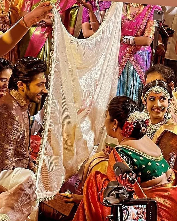 For the wedding ceremony, Niharika looked every bit the stunning South Indian bride in a red and gold kanjeevaram pattu teamed with an embroidered green blouse. Dazzling traditional jewelry, muted makeup, and flowers in her hair finished her look. Chaitanya opted for a rich copper and gold sherwani that perfectly complemented her look, as well as the gold saree she later donned. The beautiful couple can be seen smiling joyously in the pics shared on social media, along with their gorgeously dressed family.