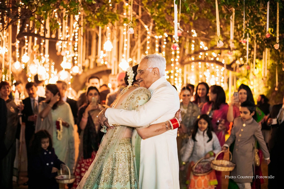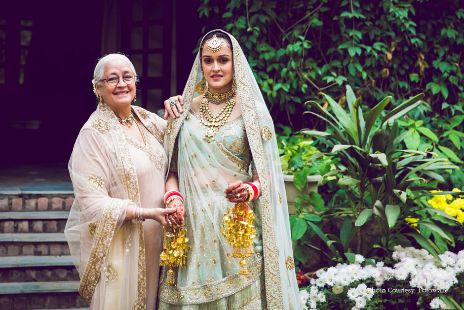 The bride and groom looked ethereal in subtle colors for their evening Jaimala ceremony. Pia opted for a mint green Sabyasachi lehenga paired with beautifully layered necklaces. Her statement maang tikka went perfectly with her look. The bride even managed to wear family heirlooms. She says, “My mother bought me my wedding set years ago. I added an antique choker that mom gave me and the set was perfect. My sister gave me the tikka I was wearing for the wedding which my mom specially designed and I also borrowed my sister’s aquamarine ring for the wedding ceremony as my grandmother believes, that we must wear something old, something new, something borrowed and something blue for one’s wedding.”
