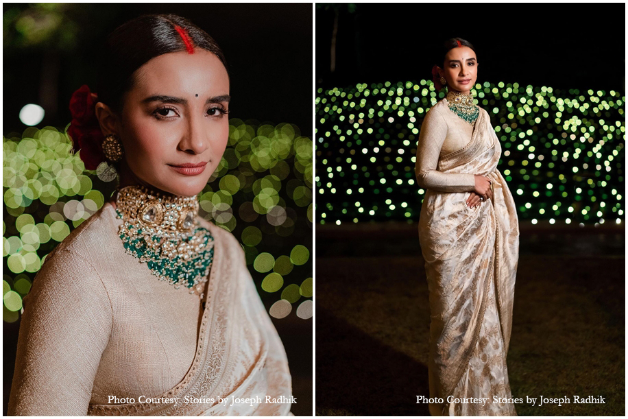 On the makeup front, Patralekhaa chose to keep it light and simple with an understated pout and a traditional chandan design dotted over her eyebrows. Accessorizing her look was jewellery crafted out of 22k gold and diamonds with a kundan encrusted mathapatti, a statement nath, kundan studded jhumkas, a necklace, heavy gold balas, and a statement ring.