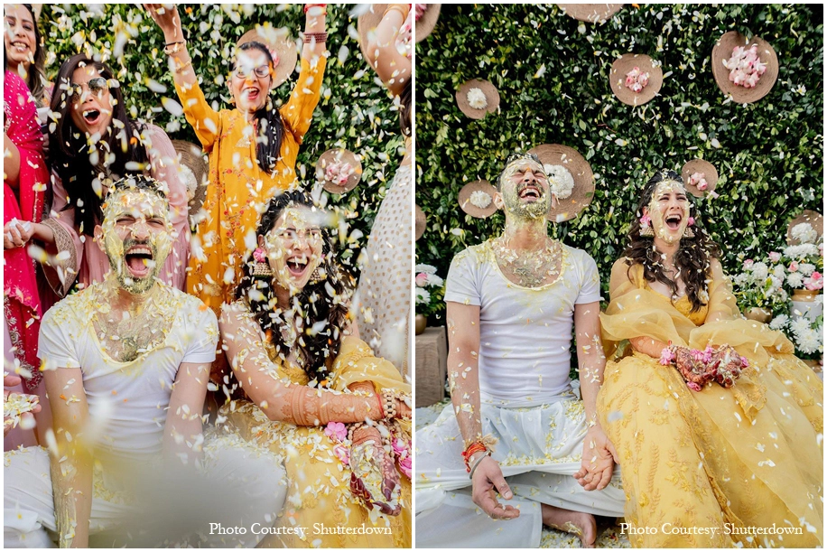 The Haldi function framed their pure moments of joy and celebration with a minimal decor of white and pink flowers to elevate the surrounding greenery. A foliage wall decked with arrangements of rattan and flowers made for a quirky backdrop at the ceremony where the couple was doused with haldi and tons of love. Vikrant kept it elegant with an ivory kurta and bandi jacket set, while Sheetal looked radiant in a vivid yellow lehenga.