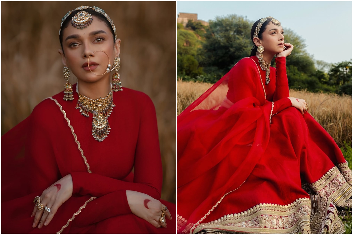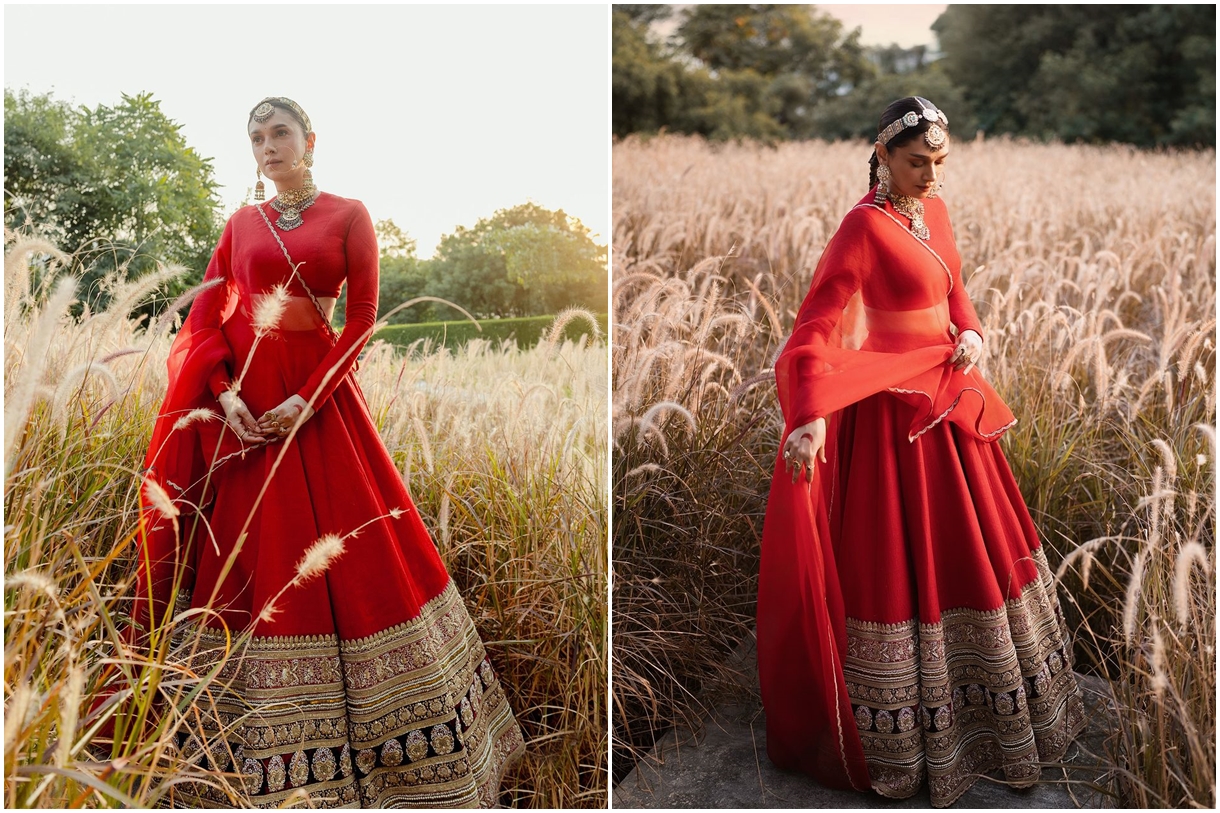 Aditi’s red wedding lehenga made a vibrant splash. With a wide zari border on the hem and a full-sleeve choli, the outfit made jaws drop with its simplicity and striking hue. The scallop-edged dupatta, the statement matha-patti, and the enamelled jhumkas with matching gold necklace synced in perfectly with the burnished gold embellishments of the lehenga.