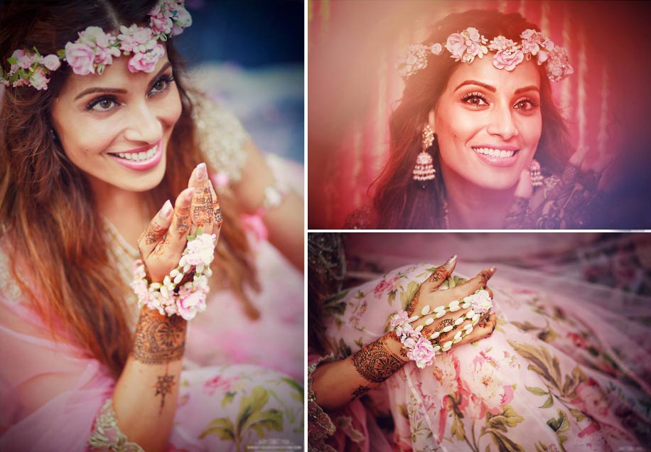Bipasha looked stunning in a pink and pistachio floral ensemble by Anushree Reddy and floral jewellery by Ceremonial Hues for her mehndi ceremony at Villa 69, Juhu, Mumbai. She accessorized with a floral clutch by Princesse K.