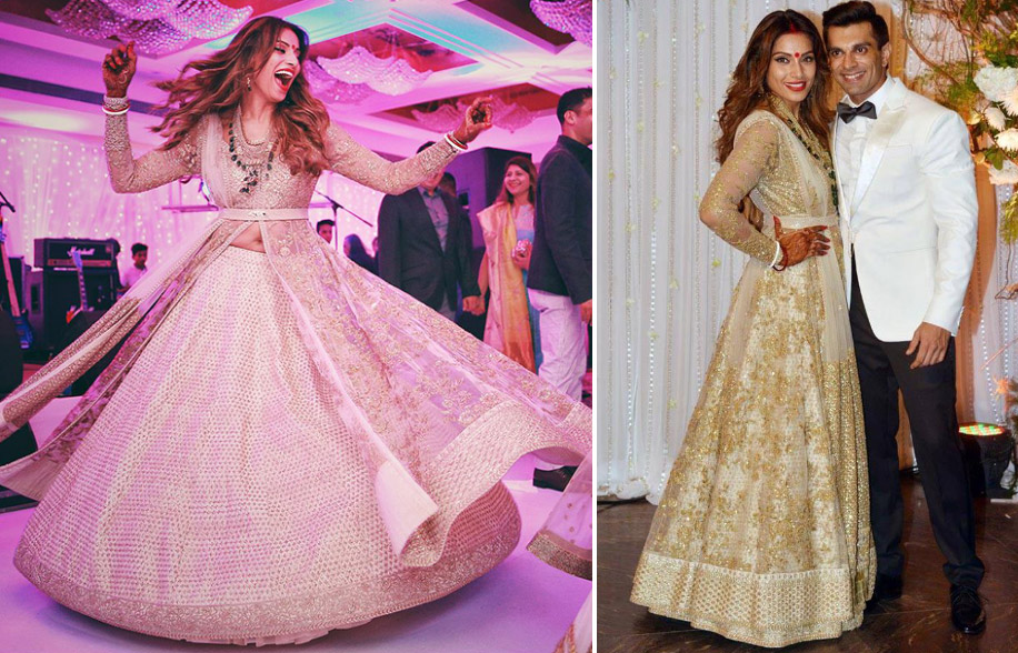 Post the wedding, the couple threw a reception party which which was attended by Bollywood’s biggies like Salman Khan, Aishwarya Rai Bachchan, Amitabh Bachchan, Shah Rukh Khan, Preity Zinta, Sushmita Sen, Dino Morea, Riteish Deshmukh, Sopjie Choudhary, Dia Mirza and more. Bipasha wore a gold floor-grazing anarkali by Sabyasachi Mukherjee that was paired with a 35 layered necklace and earring set in the finest Basra pearls and ganthoons, strung with antique jadau pieces and emerald drops from Jaipur Jewels.