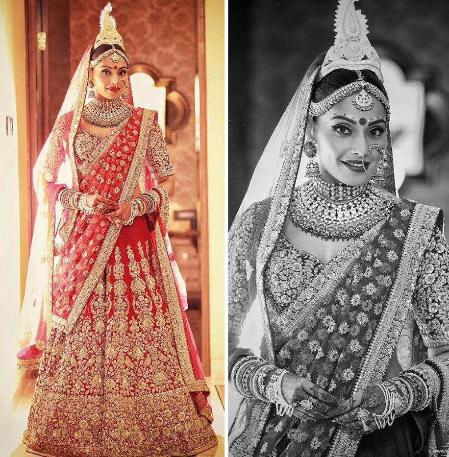 For the pheras at st. Regis Mumbai, she donned a red and gold Sabyasachi Mukherjee lehenga saree She accesorized with a heavy mathapatti by Kishandas Jewellery and the traditional mukut and Bengali bridal makeup.
