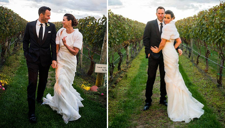Bridget Moynahan said “I do” to businessman Andrew Frankel in an intimate ceremony with family and friends at Wolffer Estate in Sagaponack, New York. J. Mendel designed Moynahan’s sleek and unique fall-inspired mermaid-shaped gown with a multitude of layers of bias strips. To accentuate the dress, hairstlyist Van der Linde created small silk organza rosebuds that he placed into her hair. A single ostrich bar was tied around the base of the rosette for texture and movement.