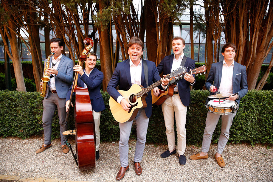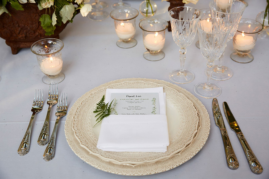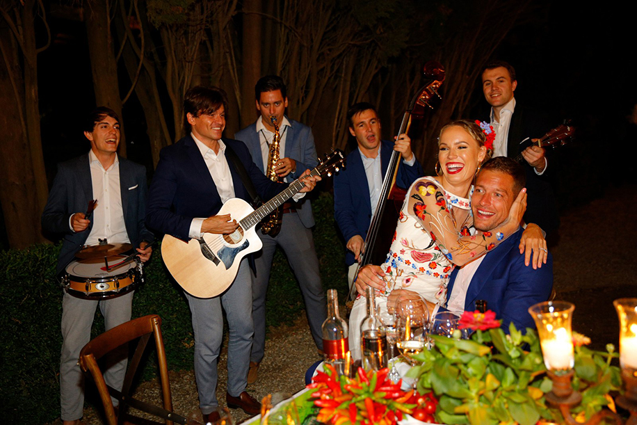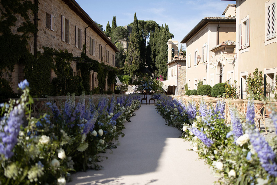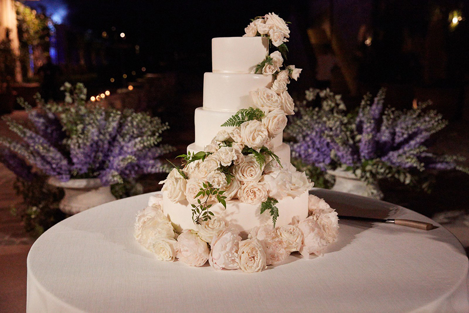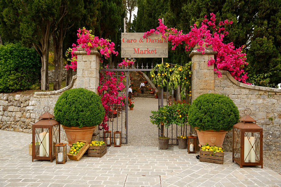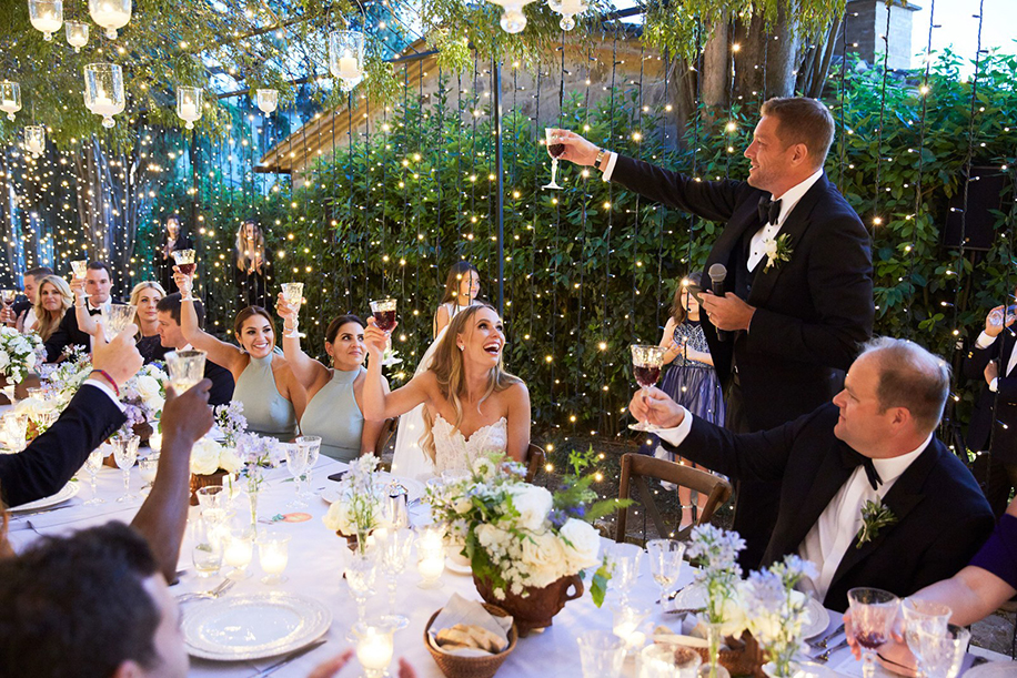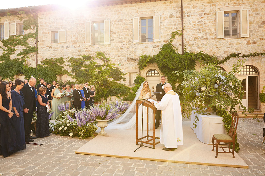 After a busy morning, everyone gathered for ‘La Dolce Vita’, their market-themed rehearsal dinner. This was an evening inspired by the destination of the wedding and was complete with music by the Italian band The Gypsy Queens along with a spread that included cuisines from Italy’s different regions. Caroline wore a white dress that featured embroidery reminiscent of spring by Temperley London. Her hair was pulled back into a braided updo that was decorated with bright blooms that matched her outfit, and a few curled locks were left loose to frame her face.
