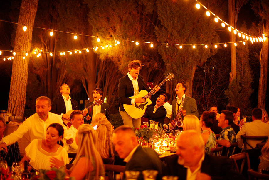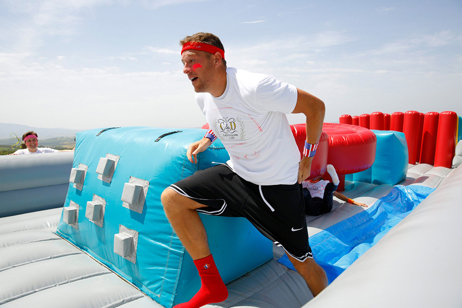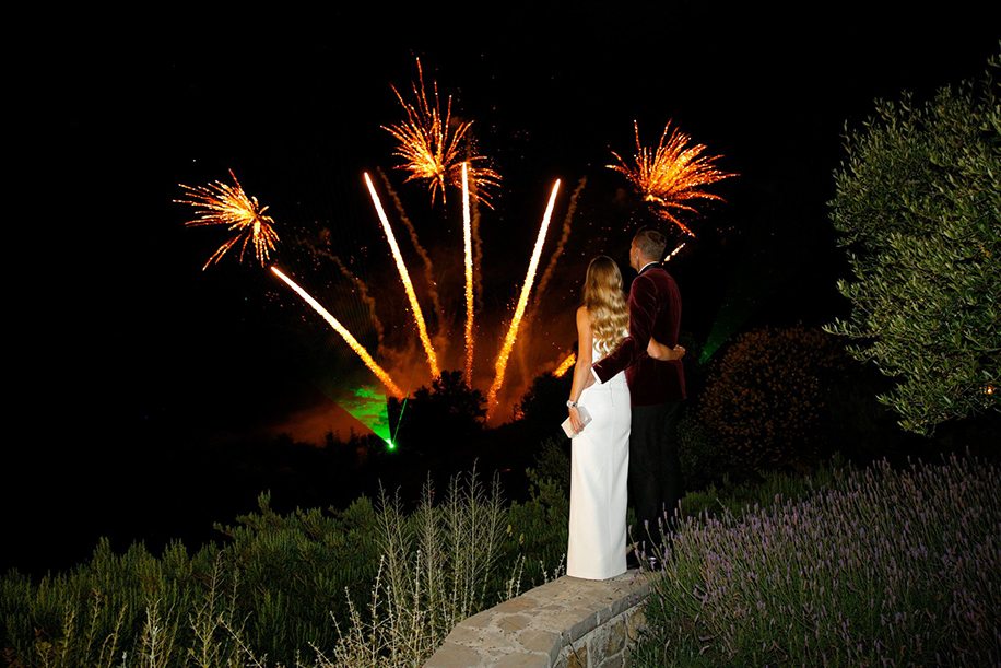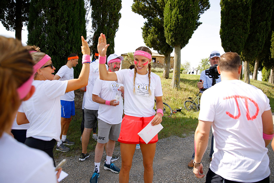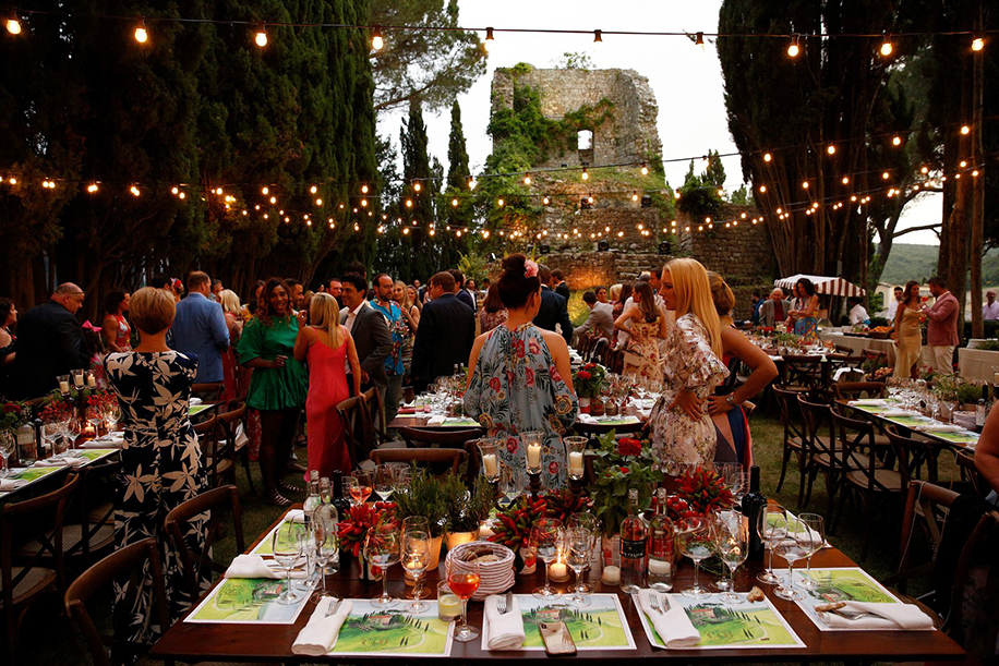 At the welcome dinner and cocktail party, Caroline wore a white gown by Roland Mouret. Her hair, styled in soft waves, fell over her shoulders and clusters of diamonds cascaded down her ears. The night saw a laser show and fireworks which made for a glittering start for their three-day festivities. For this couple and their athletic bridal party, the next day saw a bunch of activities taking place. Everyone, including the bride and the groom, sported tee shirts, shorts, and sweatbands to take on the challenges that awaited them such as obstacle races, tug-of-war and relays.