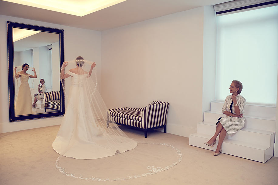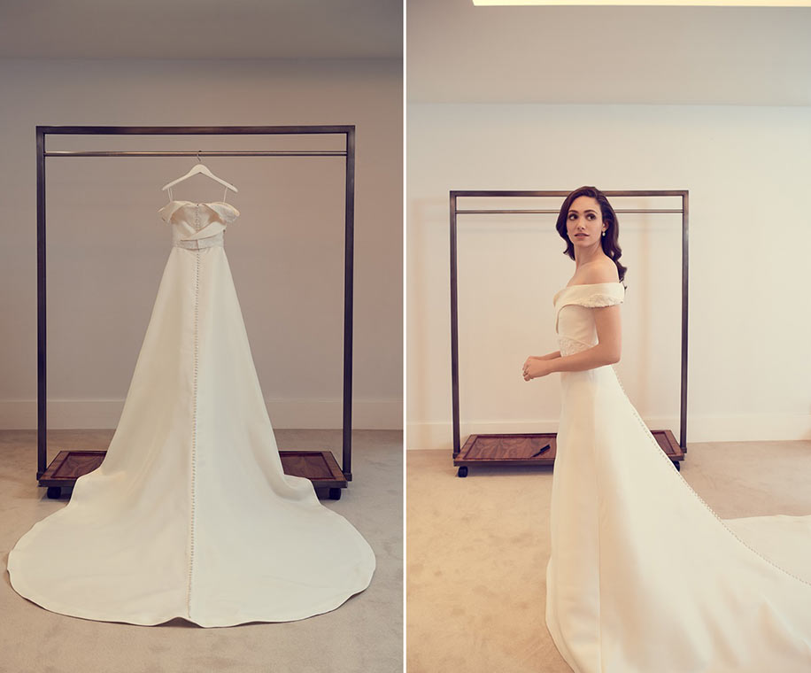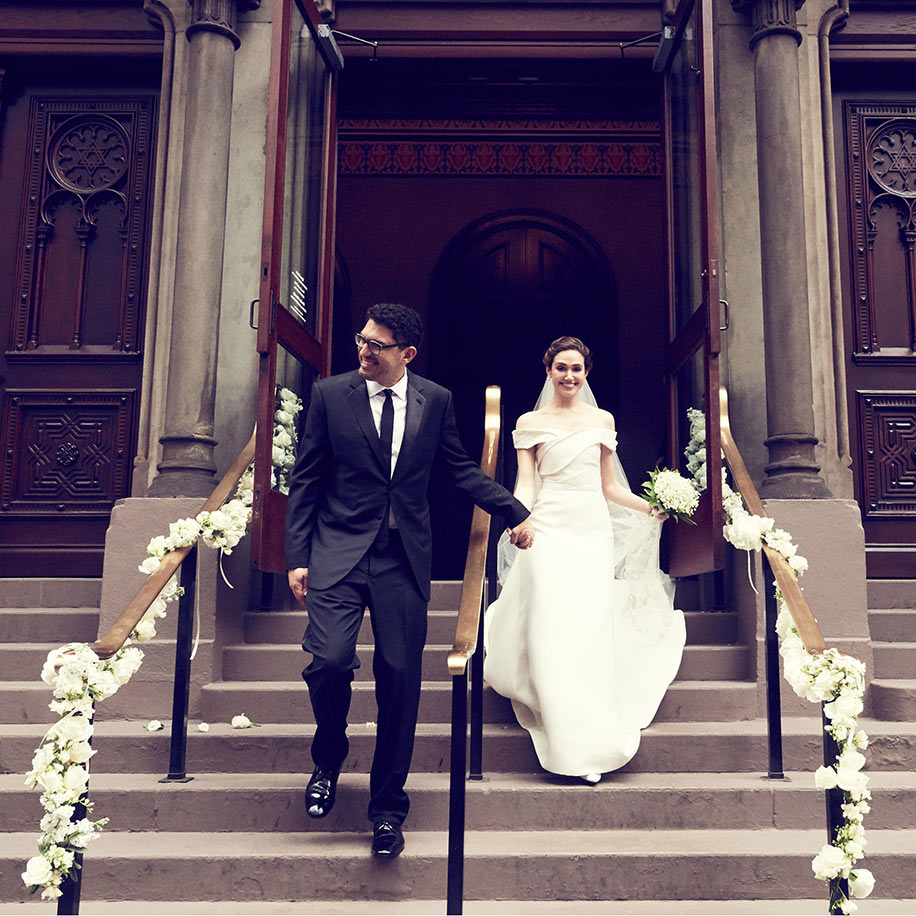 Standing at a lavish alter of flowers at Central Synagogue Rossum kept her wedding day style simple and elegant, wearing an embroidered, all-white off-the-shoulder Carolina Herrera dress with a dramatic train. The dress also had a sash of embellished beading around the waist, plus a full train and tons of tiny fabric buttons running down the entire length of the gown in back. For the ceremony, Rossum wore a floor-length lace veil. Her hair was pulled back into an understated updo, which she topped with a long, sheer veil. She accessorized with champagne-colored pumps and a clutch to match. Esmail also went for a traditional look, sporting a clean-cut black suit with a black tie.
