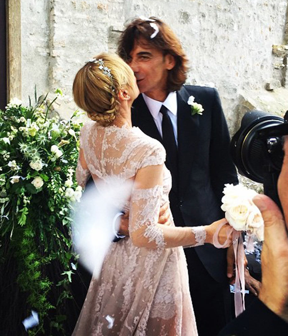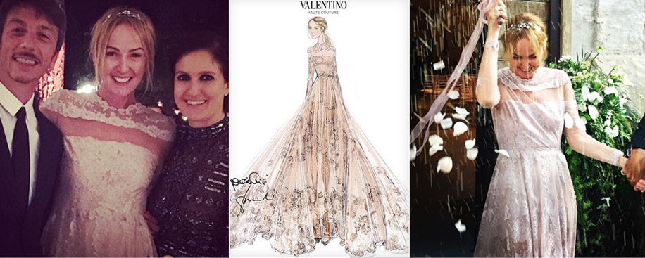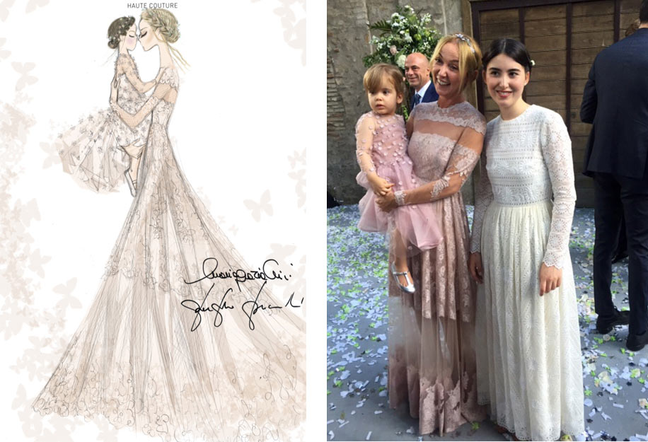 Ex-Gucci creative director Frida Giannini married her ex-Gucci CEO partner Patrizio Di Marco in a beautifully traditional wedding in Rome and the bride work pink! Giannini and the couple’s daughter, Greta, both wore pale pink bespoke dresses made by Valentino creative directors Maria Grazia Chiuri and Pierpaolo Piccioli. The designers later shared sketches of the long-sleeved lace and sheer paneled dress on Valentino’s Instagram page.