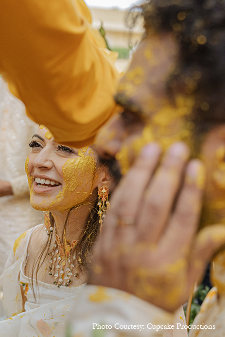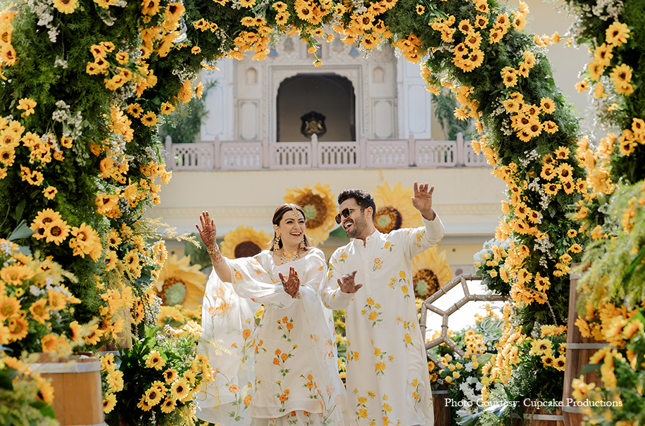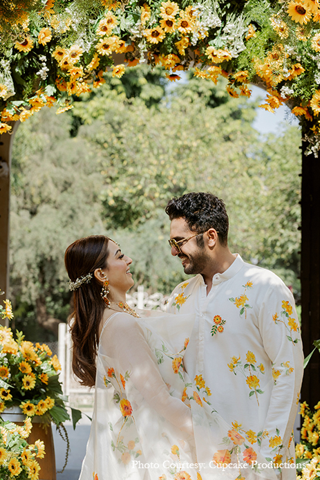 For her haldi, Hansika matched the beautiful, vibrant decor of sunflowers with a dainty white sharara set that featured yellow flowers. A soft, youthful visage and floral jewellery in hues matching her outfit complemented her bridal glow.