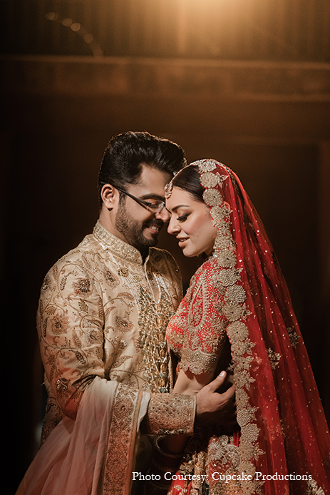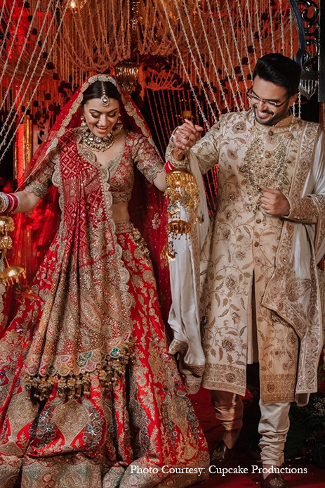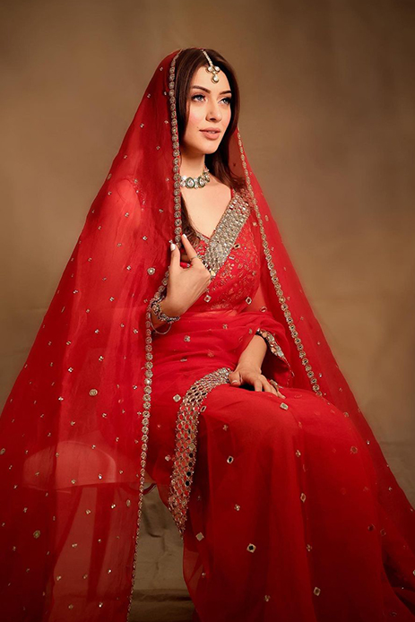 For her wedding, Hansika opted for a stunning red lehenga from the couture line of Rimple and Harpreet Narula, which featured a handcrafted skirt with resham zardozi, Kashmiri tilla, dabka, nagshi, sequins, and pearls. She teamed her lehenga with an exquisite red blouse with intricate embellishments and threadwork, as well as two dupattas for that undeniably royal look. Nude makeup and bold smokey eyes perfectly accentuated her angelic features and striking grey eyes, while ornate polki jewels and massive gold kaleerein added that wow factor.