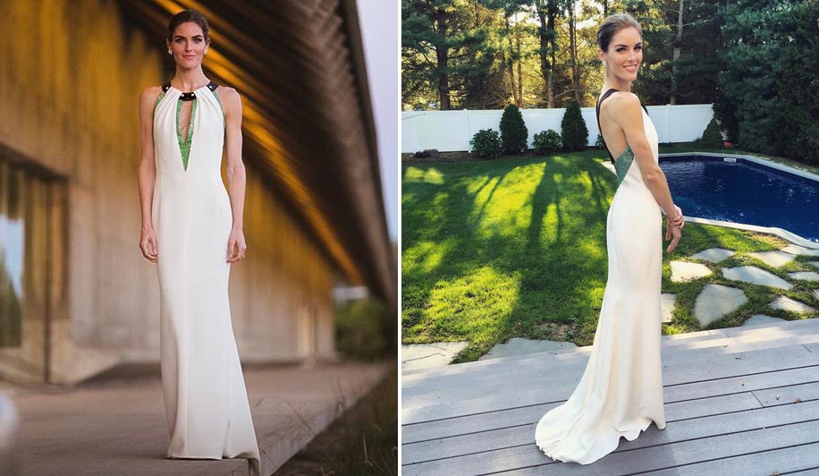 Top model Hilary Rhoda tied the knot with her fiancĂ© of almost two years, former NHL player Sean Avery, at an intimate ceremony at the Parrish Art Museum in Hamptons. The bride wore a sleek Carolina Herrera column gown – with a black fastening at the neck, adorned with subtle emerald green embellishment – and 14.7 carats of Chopard diamonds. The dress’s low back, encased by two thick black straps, was covered for the ceremony by a long veil. The bride’s attendants wore black.