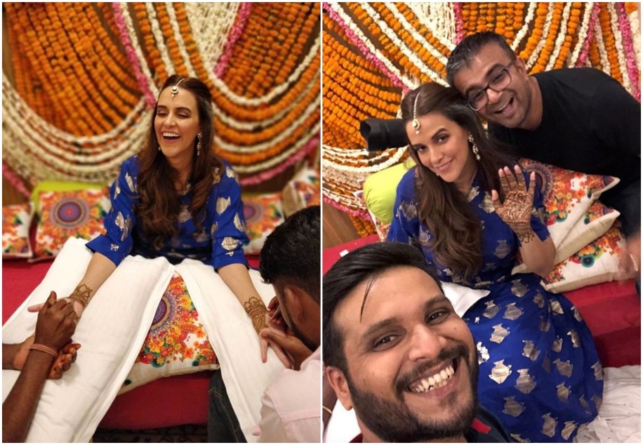 The pre-wedding celebrations included a fun Mehndi function, and in keeping with the vibe of this event, Neha wore a royal blue Fish Khadi kaftan dress from the House of Masaba. Her sleek open tresses, a simple ‘maang tikka’ (forehead ornament) and long earrings completed her refreshing Mehndi look.