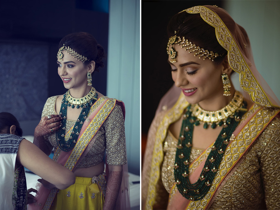 Priya looked beautiful in a bright yellow lehenga featuring gold-thread embroidery and a pink hem. Her gold blouse and dual pink net dupattas added a further festive touch to the ensemble. One pretty pink net dupatta was draped over her head, while the other was placed sash-style across the front. Her jewellery included a regal ‘matha patti’ and ‘maang tikka’ (forehead ornaments), alongside a green multi-strand emerald necklace and chunky choker with matching earrings. The bright red of her ‘chooda’ (bridal bracelets) added a further pop of color to her look. Kanwaljit wore a rich sherwani jacket with white trousers and a pink ‘safa’ (turban) that matched Priya’s dupattas. Given her years of experience in the TV industry, Priya was sure of the makeup she wanted. She exuded a natural glow at her day wedding, and looked every inch a star. For her reception and ‘bidaai’ (farewell ritual for bride) outfit, she donned a pretty red salwar suit and gold jewellery which was especially gifted to her by her mother-in-law.