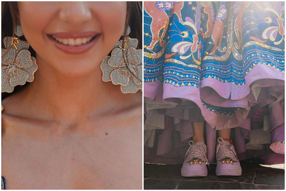 Eschewing the usual yellow hue, Rakul went for a bright purple hue! The choli beaded with Swarovski stones shone bright under the sun while the sequinned lehenga with its quirky jungle print made a bold statement! On the jewellery front, the bride kept it simple with large grey floral danglers and matching hathphool. Finishing off the look were custom baby pink sneakers.