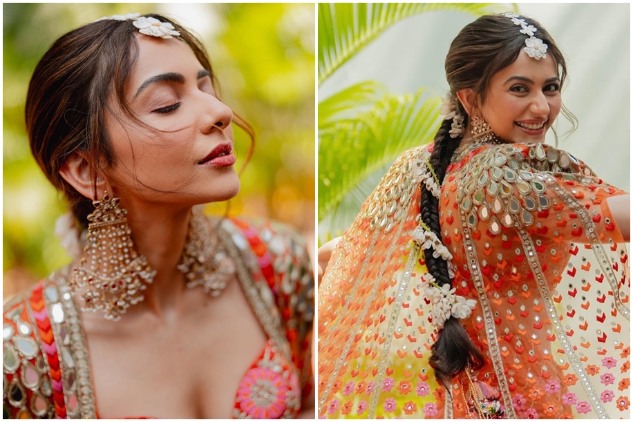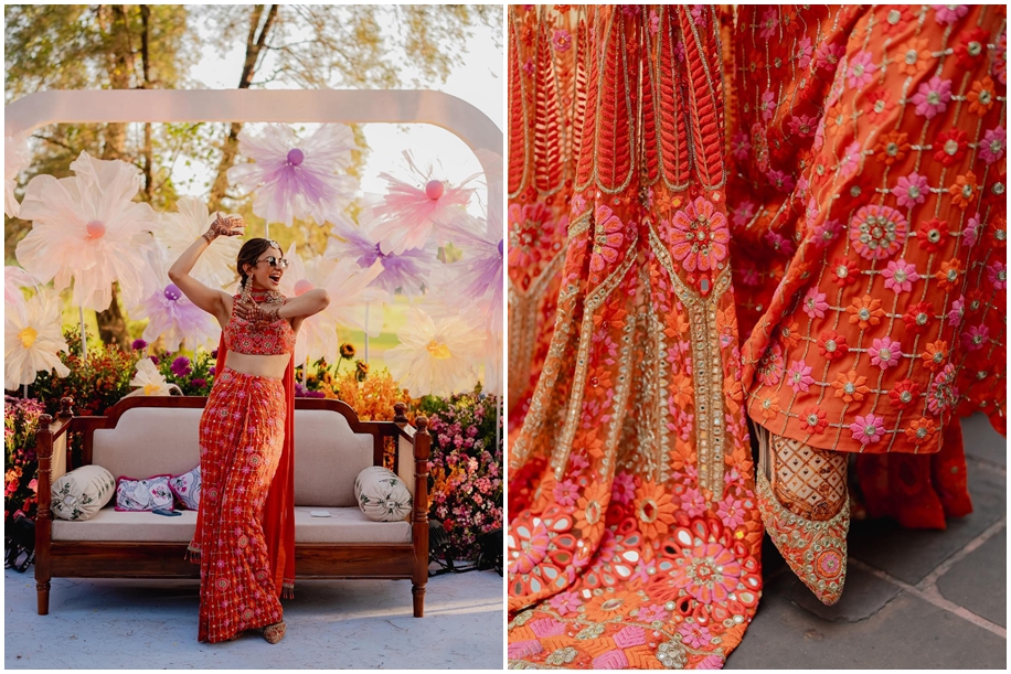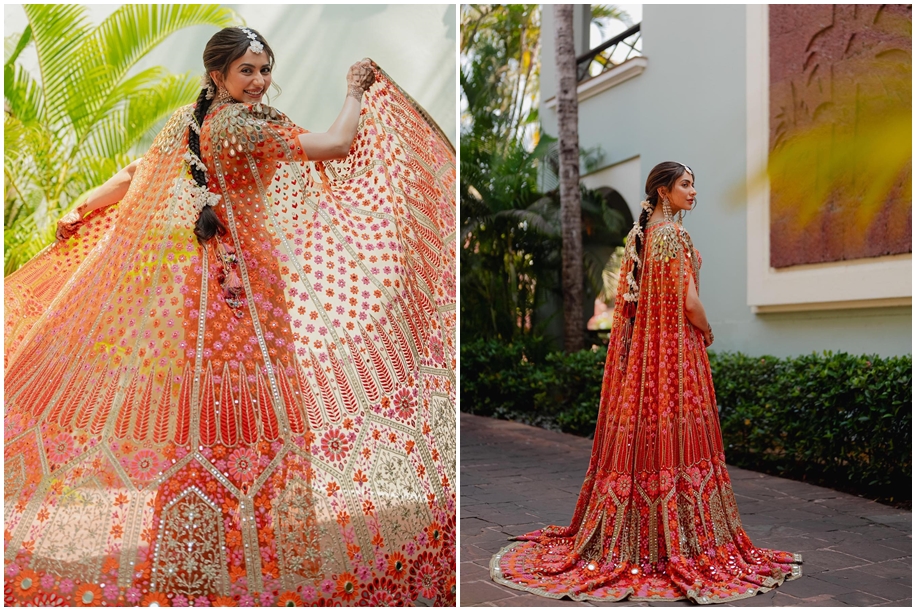 Expressing her Punjabi heritage, Rakul’s mehndi outfit was a thoughtful nod to her roots. Punjab’s celebrated phulkari patterns graced her toasted orange and pink ensemble. The elaborate hand-embroidered cape, complemented by a corset blouse and a pleated skirt blended traditions with a modern silhouette.